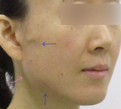 在其他医院施行提升术后颧骨下侧有凹陷现象,并皮肤被挤到耳朵下部位,想要整理脸部线条、去除提升线头的患者