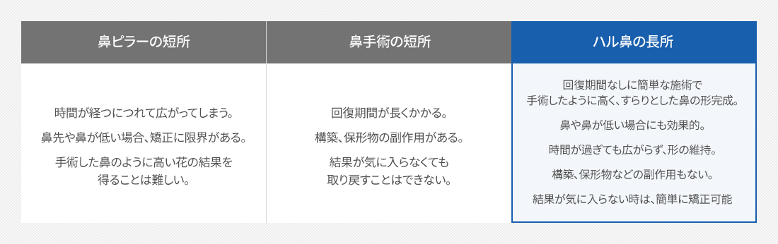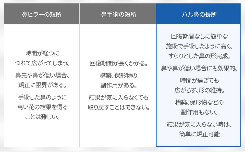 既存の鼻フィラーの 手術だけでは 限界があった鼻先を 十分に高めることができ、 ピラーの施術の丈夫な 支えの役割をしてくれるので 繰り返さ施術の際、 鼻が 広く広がってち びってしまう短所を 補完し、 高くてすらっとした形が より長く維持できます。